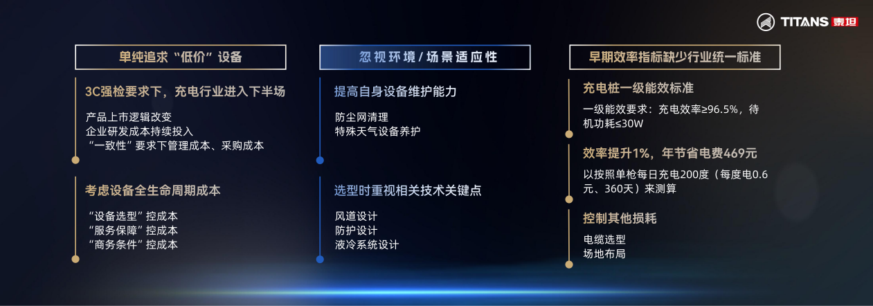 李佳博指出,隨著行業(yè)進(jìn)入規(guī)范化、精細(xì)化發(fā)展,運(yùn)營商在設(shè)備選型上普遍面臨三大關(guān)鍵挑戰(zhàn)。首先,是設(shè)備可靠性問題。單純追求低價(jià)設(shè)備可能導(dǎo)致故障率高、維護(hù)成本攀升及電損嚴(yán)重,直接影響運(yùn)營收益與用戶體驗(yàn)。對此,建議運(yùn)營商應(yīng)從“設(shè)備全生命周期成本”角度綜合考量,重視設(shè)備在功能及防護(hù)方面的關(guān)鍵技術(shù)設(shè)計(jì),關(guān)注即將實(shí)施的充電樁一級能效標(biāo)準(zhǔn),以效率提升和控制耗損雙管齊下控本增效。